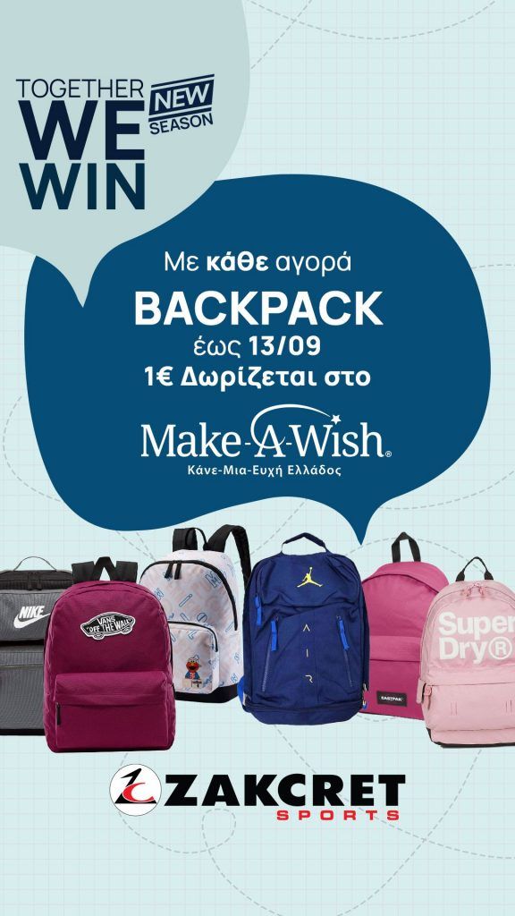 Έπειτα από την εκπλήρωση του μικρού Φάνη, τα ZAKCRET Sports στήριξαν για άλλη μια φορά το Make-A-Wish Greece, ενόψει της έναρξης της σχολικής χρονιάς! Η ελληνική εταιρία casual & αθλητικών ειδών προχώρησε σε μια ειδική ενέργεια, στο πλαίσιο μιας ανιδιοτελούς προσπάθειας προσφοράς αγάπης και χαράς σε κάθε παιδί που βρίσκεται αντιμέτωπο με κάποια πολύ σοβαρή ασθένεια. Από τις 25 Αυγούστου έως τις 13 Σεπτεμβρίου, με κάθε αγορά backpack, 1€ δωριζόταν στον Οργανισμό Κάνε-Μια-Ευχή Ελλάδας, με σκοπό να γίνουν ακόμα περισσότερες ευχές, πραγματικότητα.