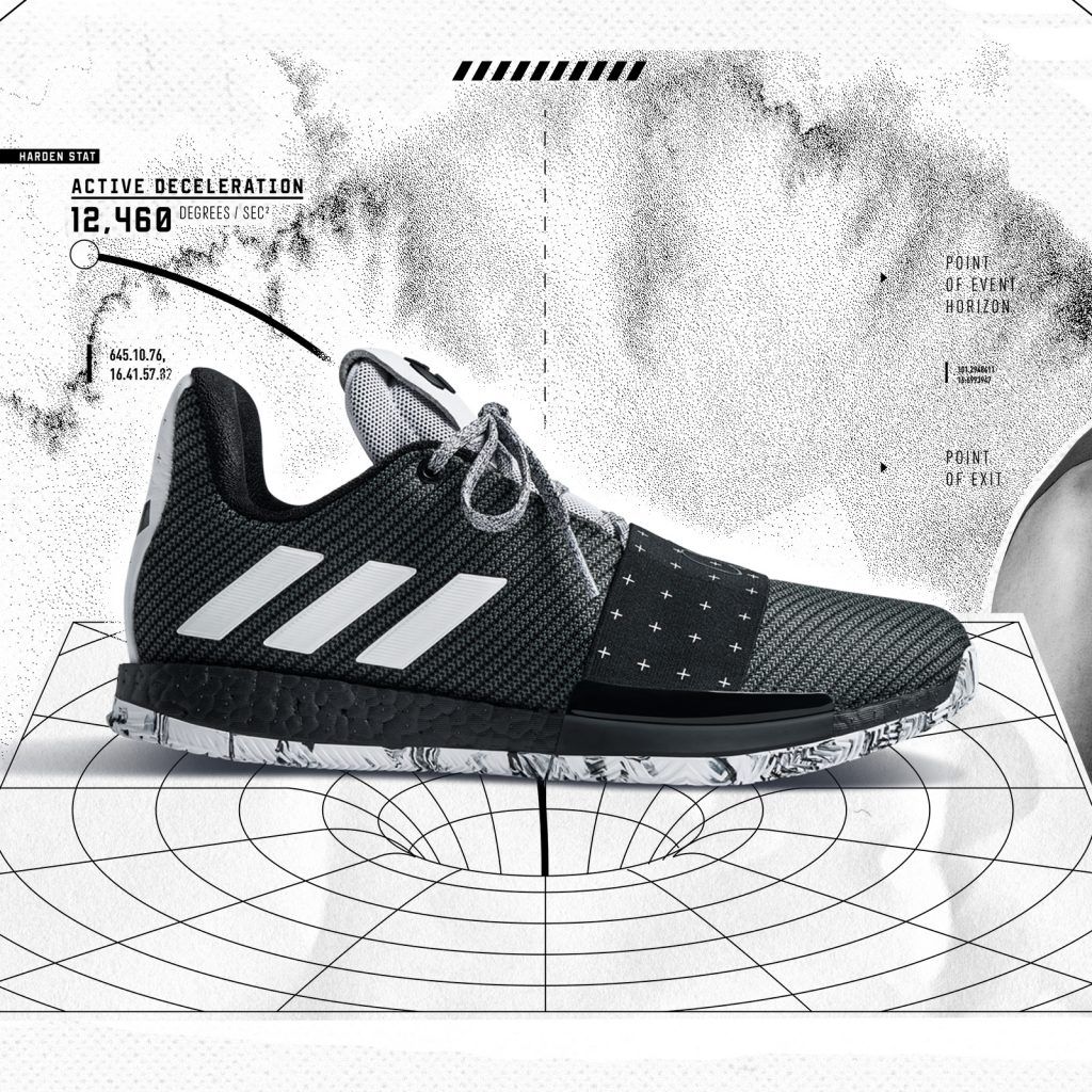 Το “Cosmos” με ασπρόμαυρη χρωματική παλέτα και με ολόμαυρη BOOST σόλα υπογραμμίζει την ικανότητα του Harden να κρατάει τους αμυντικούς σε απόσταση.
